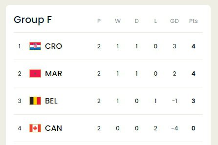 Очолюють групу F команди Хорватії та Марокко, які мають у своєму активі по чотири бали. У Бельгії – три.