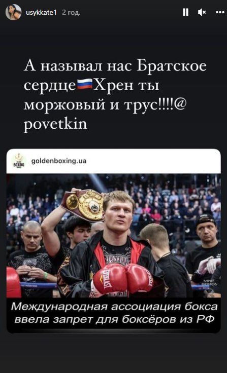Дружина чемпіона світу з боксу у суперважкій вазі Олександра Усика Катерина звернулася до російського боксера Александра Повєткіна.