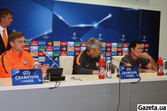 На передматчеву прес-конференцію напередодні повторної гри з "Рапідом" наставник "Шахтаря" Мірча Луческу прийшов у супроводі асистента Олександра Спиридона і форварда Олександра Гладкого.