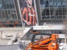 Двоє фанів "Роми" виходять з магазину з великими пакунками. Фотографуються біля великого гранітного м'яча.