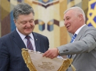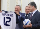 У свою чергу Григорій Суркіс вручив Петру Порошенку м'яч з автографами гравців "Динамо" 1986 року. А президент біло-синіх Ігор Суркіс подарував главі держави динамівську футболку із символічним 12-м номером.