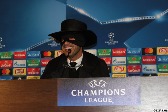 Після матчу всі чекали на Паулу. І Фонсека не розчарував. Португалець зайшов у конференц-зал не тільки в масці Зорро. Наставник одягнув також капелюх, плащ і мав при собі шпагу.