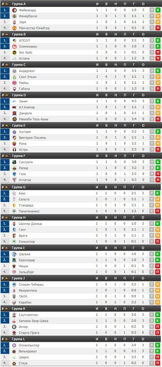 Відзначимо також сенсаційну перемогу "Фейєноорда" вдома над "МЮ", 1:0. "Шальке" Євгена Коноплянки мінімально в гостях обіграв "Ніццу", 1: 0. Українець вийшов на поле на 53-й хвилині. А бельгійський "Андерлехт" з рахунком 3:1 вдома переміг азербайджанську "Габалу", 3:1. Один з м'ячів на рахунку Лукаша Теодорчика, права на якого належать київському "Динамо".