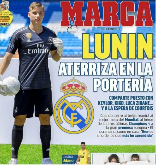 24 липня Андрій Лунін офіційно був представлений гравцем "Реала". 19-річний українець потрапив на першу шпальту видання, де пишуть, що він позмагається за місце у воротах мадридців із 4 конкурентами.