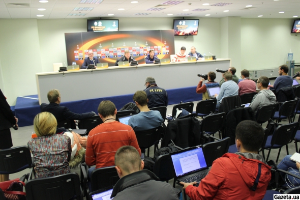 "Прошу вибачення за запізнення. Вечером у Львові важкий рух на дорогах, - сказав Ванхазебрук у своєму вступному слові до журналістів. - В Україну прилетіли 24 футболісти, за винятком Маттоне, Суммаха і Схофса".