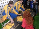 Глядачів запускають порціями. Одна з уболівальниць підносить футболістам подарунки. Розкрити їх гравці відмовляють.