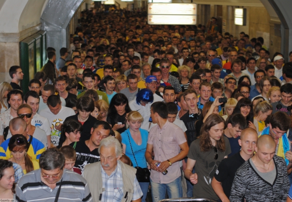 За пів години до початку матчу Україна - Франція в метро "Хрещатик" - натовпи людей.