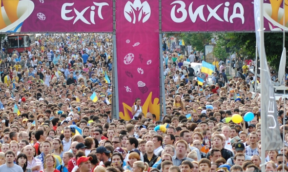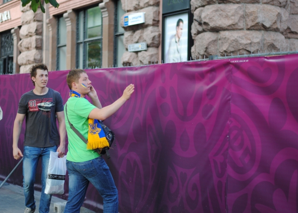 Біля "Гранд Галереї" на Хрещатику чоловік тримає табличку "Билеты на Евро". Цікавимося скільки коштує.