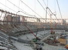 Вже розпочато роботи по закріпленню верхніх радіальних вантів до верхніх балок опорного каркасу з 80 колон. Очікується, що цей етап триватиме близько тижня.