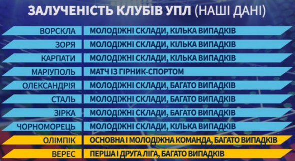 За їхніми даними, так чи інакше грали на контору усі, крім "Динамо" і "Шахтаря". При цьому "Олімпік" та "Верес" використовували не лише молодіжну, але й основну команду.