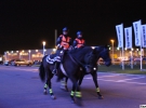 За порядком біля арени пильнує кінна поліція. Фанати ідуть на стадіон з клубною атрибутикою — шаликами, прапорами.