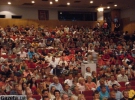 Зал переповнений, глядачі стоять у коридорах між рядами, деякі сидять на сходах, спостерігаючи за боєм.