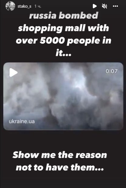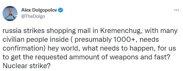 "Росія вдарила по торговому центру в Кременчуці, всередині багато цивільних. Гей, світе, що має статися, щоб ми отримали необхідну кількість зброї? Ядерний удар?" – написав тенісист Олександр Доголопов.