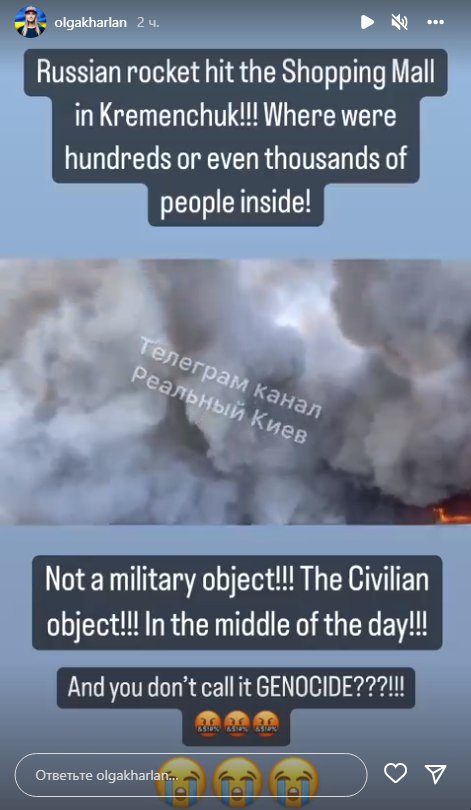 "Це просто пекло. Не воєнний об'єкт. Цивільний. Посеред білого дня! І ви не вважаєте це геноцидом?!" – поділилася емоціями фехтувальниця Ольга Харлан.