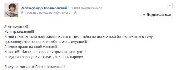 "Я не політик! Але я громадянин ! І мій громадянський обов'язок полягає в тому, щоб не залишатися байдужим до того свавілля, що дозволили собі можновладці! Я маю право на свою думку! І ніхто!!! Ніхто не має права закривати мені рот! Я один з народу! А значить, я і є народ! Я йду на мітинг у Парк Шевченка!", - написав Олександр Шовковський на своїй сторінці в Facebook.