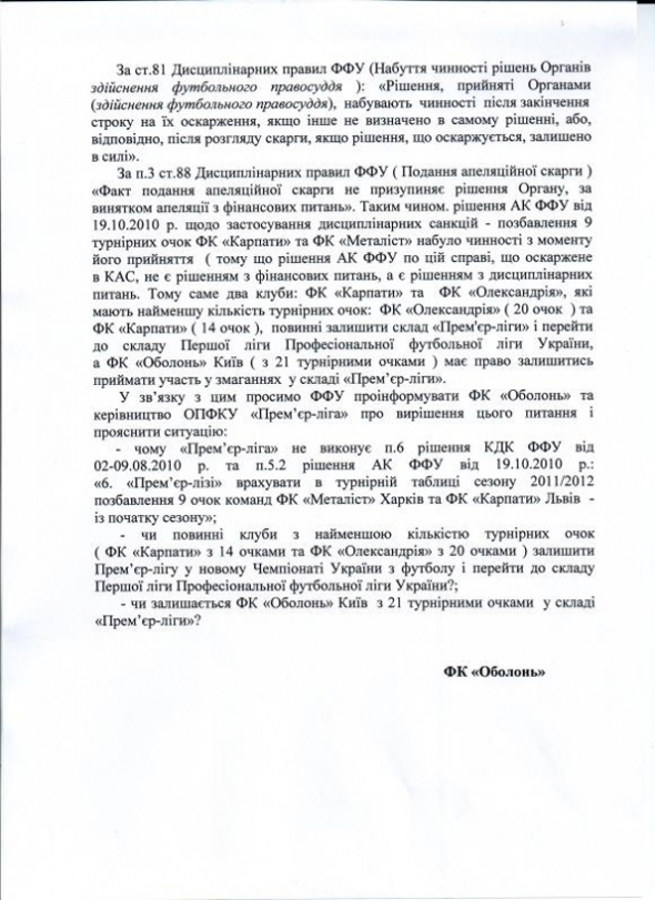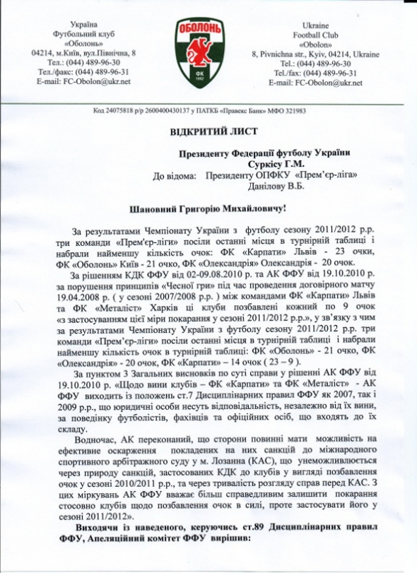 Футбольний клуб "Оболонь", який залишив українську Прем'єр-лігу за підсумками минулого сезону, звернувся до президента ФФУ Григорію Суркіса та президента УПЛ Віталія Данилова з проханням переглянути розподіл очок за минулий сезон чемпіонату в елітному дивізіоні з вимогою зняти з "Карпат", які набрали 23 пункти, 9 очок.