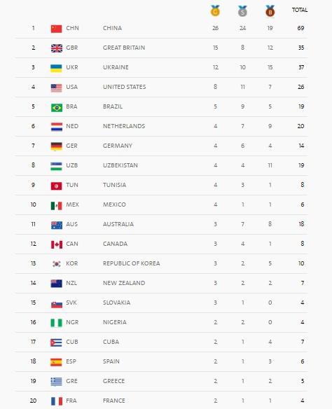 Лідерство у загальному заліку утримує Китай, який завоював 69 медалей (26 - "золотих", 24 "срібних" та 19 - "бронзових"). На другому місці йде Велика Британія (35 медалей, 12 - "золотих").