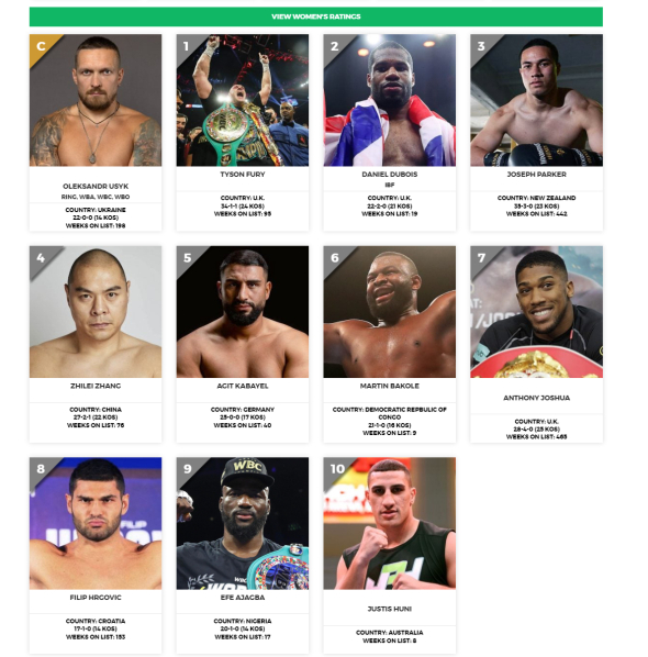 Усик очолив рейтинг після перемоги над британцем Тайсоном Ф'юрі (34-1-1, 24 КО) за звання абсолютного чемпіона світу у суперважкій вазі.