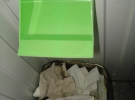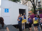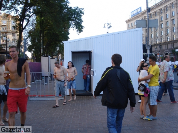 У київській фан-зоні Євро-2012 із туалету виходить жінка років 50-ти у синьому комбінезоні, в руках тримає совок.