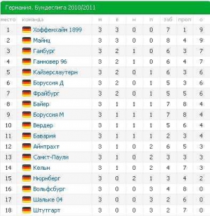 - Після трьох турів лідируючі позиції в бундеслізі несподівано захопили "Майнц-05" і "Хоффенхайм", які досі не втратили жодного очка. "Майнц" завдяки перемозі над "Кайзерслаутерном" з результатом 2:1 наздогнав на першій сходинціі команду Ральфа Рангніка.