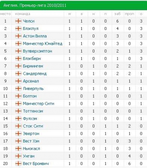Таким чином, в англійській прем'єр-лізі відбулися всі матчі першого туру (попередні зустрічі пройшли 14 і 15 серпня). З результатів варто відзначити нічию в матчі "Ліверпуль" - "Арсенал" (1:1), а також перемогу лондонського "Челсі" над командою "Вест Бромвіч Альбіон" з рахунком 6:0.