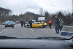 Аварія відбулася на об"їзній дорозі Ужгорода. Машина Lamborghini Murcielago вартістю 200тис. євро злетіла з дороги і врізалася в земляний вал. Ніхто не постраждав.