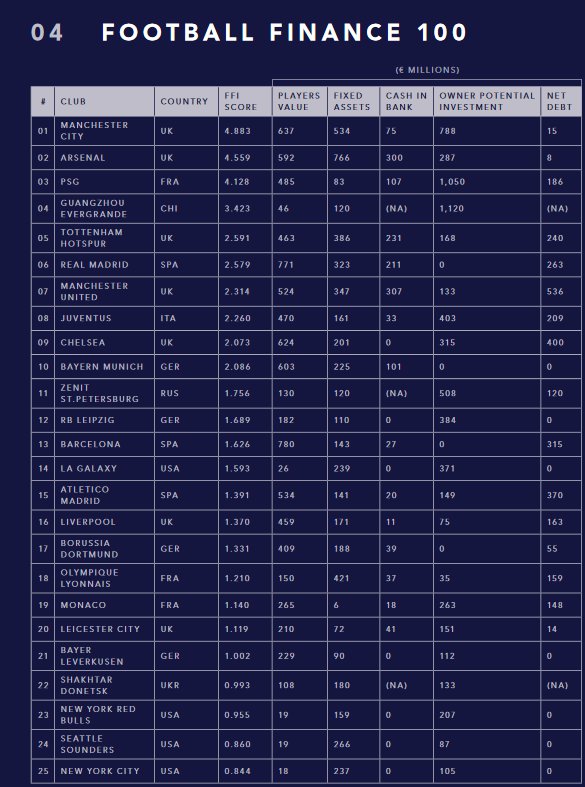 Рейтинг складався за спеціальним футбольним фінансовим індексом, розробленим Soccerex. Ключовими змінними в розрахунках були ігрові активи (вартість футболістів), фіксовані активи (стадіон, база та інша нерухомість), банківські рахунки, інвестиційний потенціал власника, борги клубу.