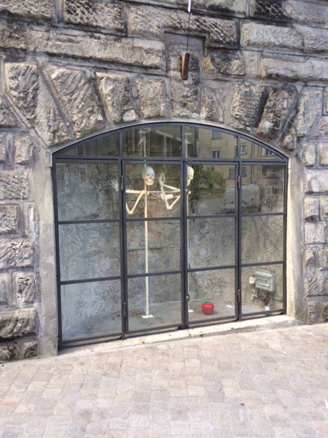 Виходжу з магазину та бачу вмонтовану в стіну скульптуру – два скелети за склом синхронно рухають кінцівками. Підбігаю, знімаю, фотографую. Дядько, що стоїть осторонь, усміхається.