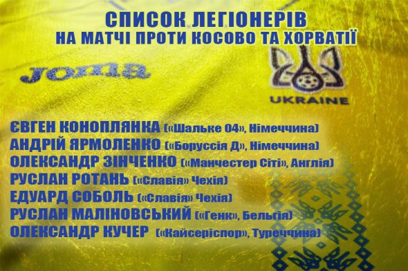 Федерація футболу України оголосила список гравців, викликаних у збірну України на матчі відбору Кубка світу-2018 проти Косово і Хорватії. Вони виступають у зарубіжних чемпіонатах.
