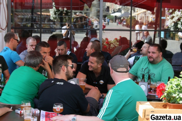 В день матчу проти "Шахтаря" фанам віденського "Рапіда" у Львові було не сумно. Дехто милувався центром міста, але чимала кількість уболівальників окупувала більшість центральних кафе, розважаючись за келихами місцевого пива.