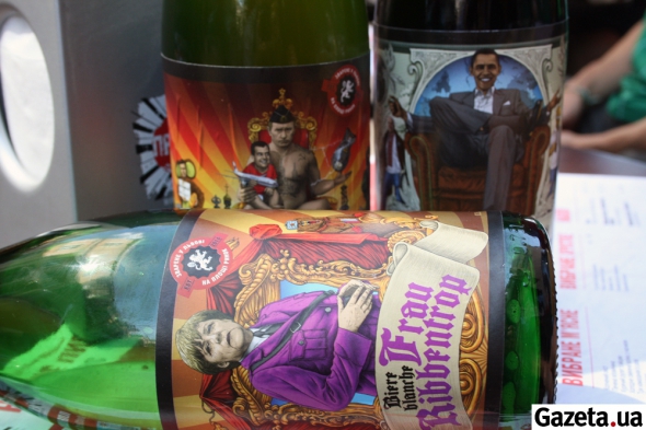 Зовні здається, що намагаються спробувати все пиво, яке є в асортименті. На столі однієї з компаній - кілька розпочатих пляшок. Просять ще, при цьому самі ж намагаються їх відкрити, не даючи це зробити офіціантам. На етикетках - комічні зображення відомих політиків - Барака Обами, Ангели Меркель, Володимира Путіна.