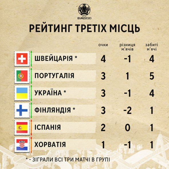 Команда Андрія Шевченка має опинитися серед найкращих чотирьох команд із шести, які зайняли у своїх групах треті місця. У рейтингу третіх місць в України – три очки й різниця м'ячів 4–5. Потрібно, щоб хоча б у двох групах збірні на третій позиції мали показники гірше, ніж в українців.