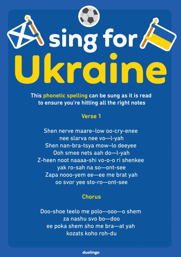 Це стало можливо завдяки застосунку для вивчення іноземних мов Duolingo. Він поширюватиме вболівальникам фонетичні посібники спрощеної версії тексту гімну у вигляді листівок.