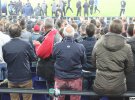 Трибуни злагоджено, ніби за чиєюсь командою, голосно підтримують своїх і грізно, навіть агресивно реагують на команду суперника.