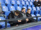 Олег Кудрик, Сергій Кривцов та Іван Петряк у спортивній формі "Шахтаря" сідають на трибуну. Футболісти не потрапили в заявку на матч.