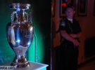 Кубок охороняли двоє чоловіків. На плечах у обох висіли автомати. Вони забороняли відвідувачам торкатися до трофею Євро-2012.