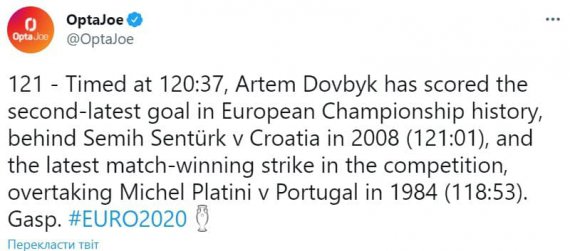 На 120-й хв. 37 с. Довбик забив найпізніший переможний гол в історії чемпіонатів Європи, повідомляє статистичний ресурс Opta у Twitter.