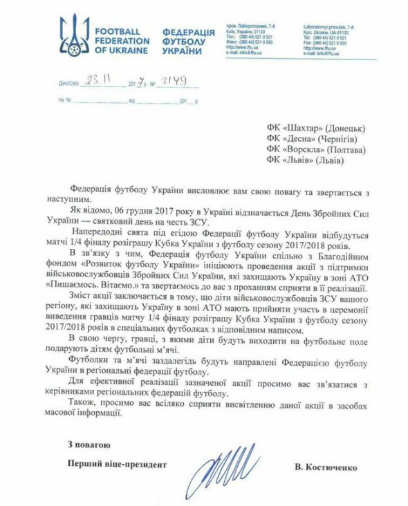 Донецький клуб проведе акцію для дітей учасників АТО під егідою ФФУ в середу, 29 листопада, перед початком домашнього матчу Кубка України в Харкові.