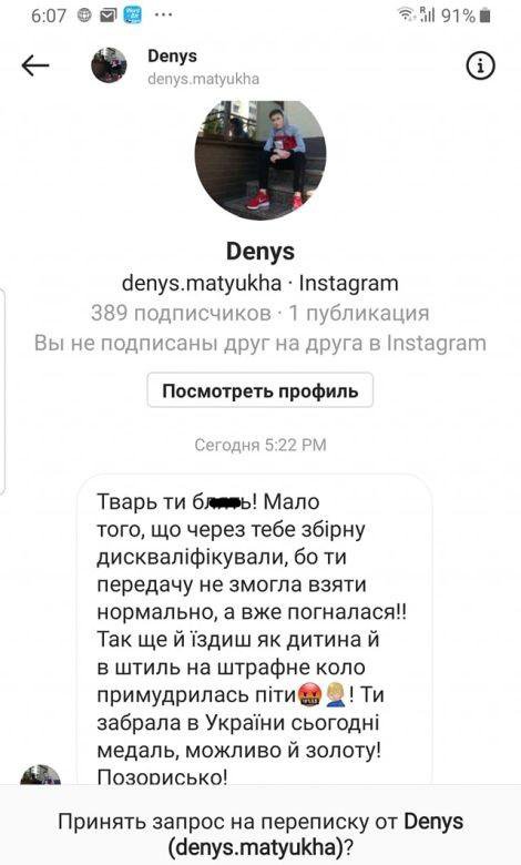 "Тварюка ти, бл*ть. Мало того, що через тебе збірну дискваліфікували, бо ти передачу не змогла взяти нормально, а вже погналася. Так ще й їздиш, як дитина - в штиль на штрафне коло примудрилася піти. Ти забрала в України сьогодні медаль, можливо, і золоту. Позорисько", - написав біатлоністці підписник.