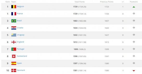 Очолюють рейтинг одразу 2 команди – збірна Бельгії та чемпіони світу - французи.