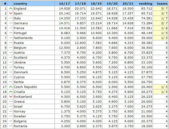 У таблиці коефіцієнтів УЄФА Україна не змогла випередити Шотландію в боротьбі за 11-те місце, повідомляє Sport.ua.