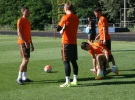Після пробіжки команда розділилася на дві групи, кожна почала ганяти в квадрат. В одній найбільш весело, потрібний тонус там весь час намагається підтримувати Даріо Срна. І це незважаючи на те, що під час Євро капітан "гірників" поховав батька. При цьому ще й примудряється завдавати підступні удари. "Відразу видно - гравець збірної Хорватії", - не упустив шансу підколоти партнера по команді Євген Селезньов. "Уже колишній", - не затримався з відповіддю капітан. "Квадратна" розминка тим часом закінчується, асистенти дають команду готуватися до вправ без м'яча.