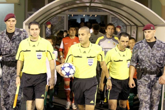 За п'ятнадцять хвилини розпочинається гра. На гостевій трибуні кілька десятків румунських вболівальників скандують "Динамо". Їх починають перекрикувати полтавські фанати.