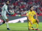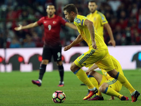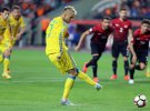 Україна вийшла вперед завдяки влучному удару з пенальті Андрія Ярмоленка на 24-й хвилині. За три хвилини наша команда подвоїла свою перевагу — Степаненко через все поле зробив довгий пас на Ярмоленка, а той скинув на Кравця. Артем не залишив голкіперу Волкану Бабаджану жодних шансів. Збірна Туреччини, маючи мінімум моментів у першому таймі, витиснула максимум, забивши гол у роздягальню: Туфан виграв другий поверх після подачі з кутового.