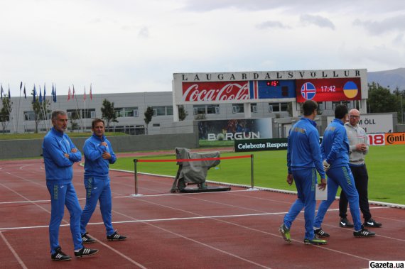 Першим на поле вийшов куратор збірних України Мирон Маркевич. Колишній наставник збірної України, "Дніпра" і "Металіста" виконав пробіжку на стадіоні "Лейгардальсведлюр".