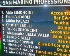 1. Перший офіційний матч збірна Сан-Марино провела в 1990 році. З тих пір команда зіграла 118 поєдинків, з яких програла 114. Єдину перемогу санмарінци здобули 28 квітня 2004 над Ліхтенштейном - 1:0. Також їм вдалося зіграти внічию з тим же Ліхтенштейном (2:2), Латвією (1:1) і Туреччиною ( 0:0).