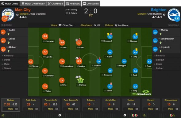 Авторитетний статистичний портал Whoscored оцінив дії Зінченка пристойною 8 – це третій результат у команді разом з Давідом Сілвою. Вищий бал отримали лише Серхіо Агуеро (8,3) та Рахім Стерлінг (9,1), які стали авторами забитих м'ячів.