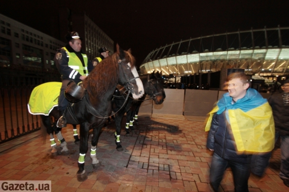 "Розігріває" глядачів "Піккардійська терція". Вона ж виконує і гімн України, колективу "акомпанує" весь стадіон. У руках у вболівальників модулі - прапори.