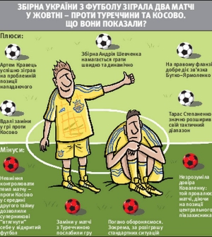 Збірна України з футболу посідає третє місце у своїй групі у кваліфікаційному турнірі до Кубка світу-2018. У трьох матчах наші здобули п'ять очок. Стартували з двох нічиїх, а в останньому поєдинку виграли у команди Косова — 3:0. Це перша перемога 40-річного Андрія Шевченка на посаді головного тренера збірної.