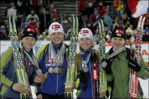 Українські біатлоністки Оксана Яковлєва, Віта Семеренко, Валя Семеренко та Оксана Хвостенко (зліва направо) після фінішу естафетної гонки. Естерсунд, Швеція, 17 лютого 2008 року